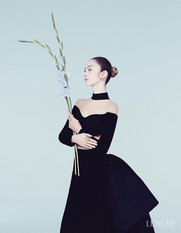 옐로 골드에 다이아몬드를 세팅한 ‘플라워레이스’ 이어링과 오른손의 링, 왼손의 비트윈 더 핑거 링 모두 반클리프 아펠.