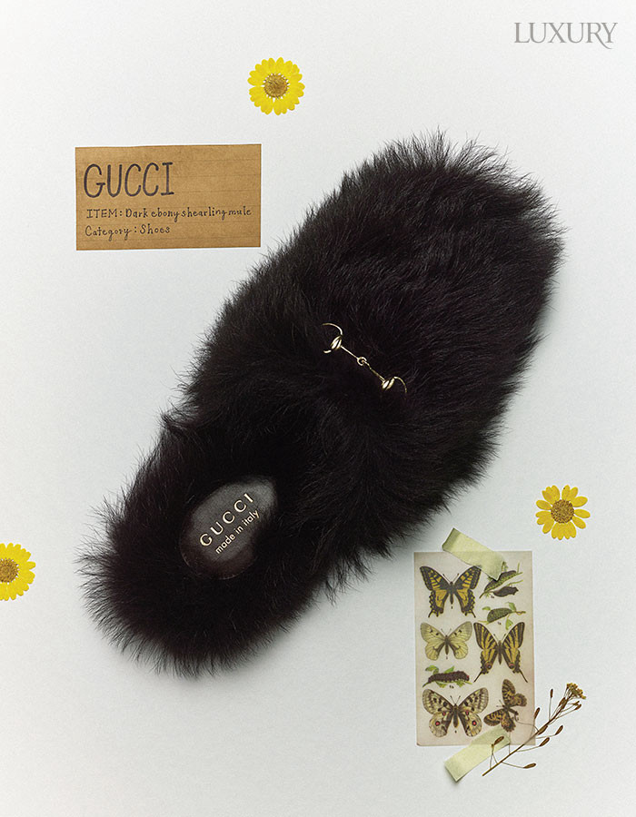 실키 메리노 울 소재의 퍼 뮬은 구찌.