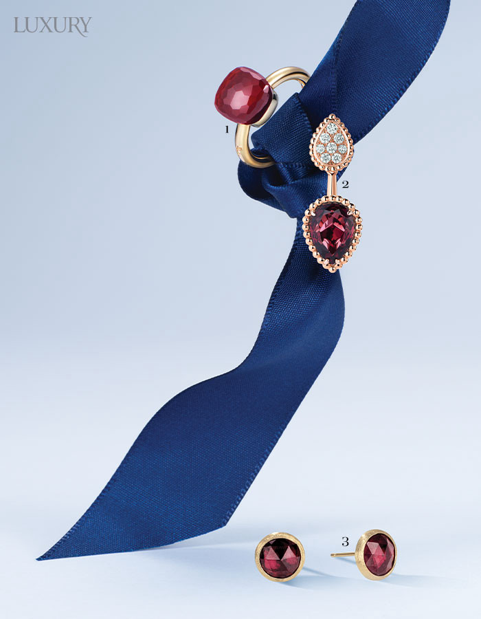 1. 가닛을 57면의 비정형 커팅으로 조각한 ‘누도 클래식’ 링. 프롱을 과감히 생략해 젬스톤의 입체적인 볼륨이 그대로 드러난다. 포멜라토 0030-8321-0441 2. 다이아몬드를 파베 세팅한 핑크 골드 스터드 와 로돌라이트 가닛 드롭이 연결된 ‘쎄뻥 보헴 로돌라이트 가넷’ 싱글 스터드 이어링. 가닛 드롭은 탈착이 가능해 다양한 스타일로 연출할 수 있다. 부쉐론 080-822-0250 3. 옐로 골드에 깊은 색감의 레드 가 닛을 원형으로 세팅한 ‘자이푸르 컬러’ 컬렉션 이어링. 피렌체에서 유래한 금세공 방식인 플로렌스 기법으로 골드 표면에 섬세한 선을 새겨 넣었다. 마르코 비체고 2118-6045