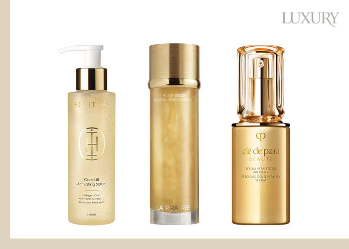프레셔스 골드 바이탈리티 세럼 24K 골드 레티놀 콤플렉스가 외부 자극으로 지친 피부를 개선하고, 장벽을 강화해 전반적인 노화 징후를 케어한다. 끌레드뽀 보떼. 퓨어 골드 리바이탈라이징 에센스 빛나는 골드 포뮬러가 광채 효과를 더하고 즉각적인 피부 진정을 도와, 세안 후 첫 단계 에센스로 제격이다. 라프레리. 코어 리프트 액티베이팅 세럼 콜라겐을 채워 탄력을 끌어올리고, 주름과 부기를 완화한다. 홀리추얼.