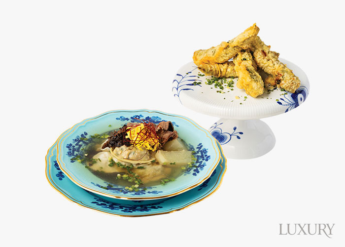 (왼쪽부터) 아삭이고추에 돼지고기와 청양고추, 마늘종으로 만든 소를 채운 ‘마늘종 고추튀김’. ‘아롱사태 무 만둣국’. 무와 아롱사태를 푹 끓인 국물이 개운하다.