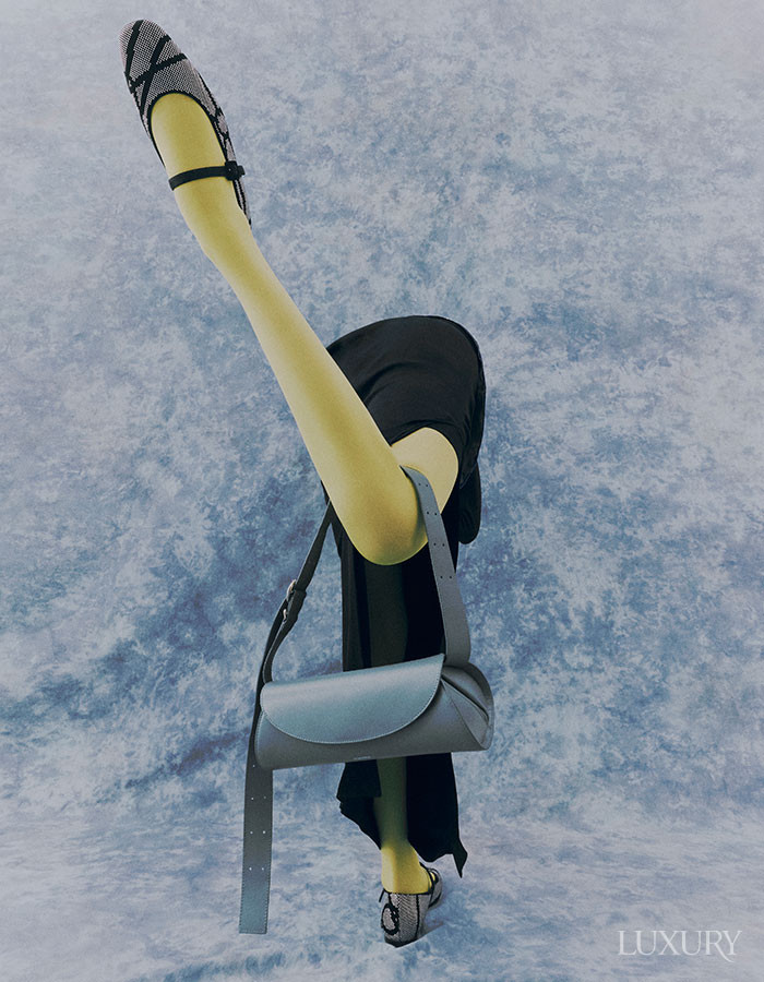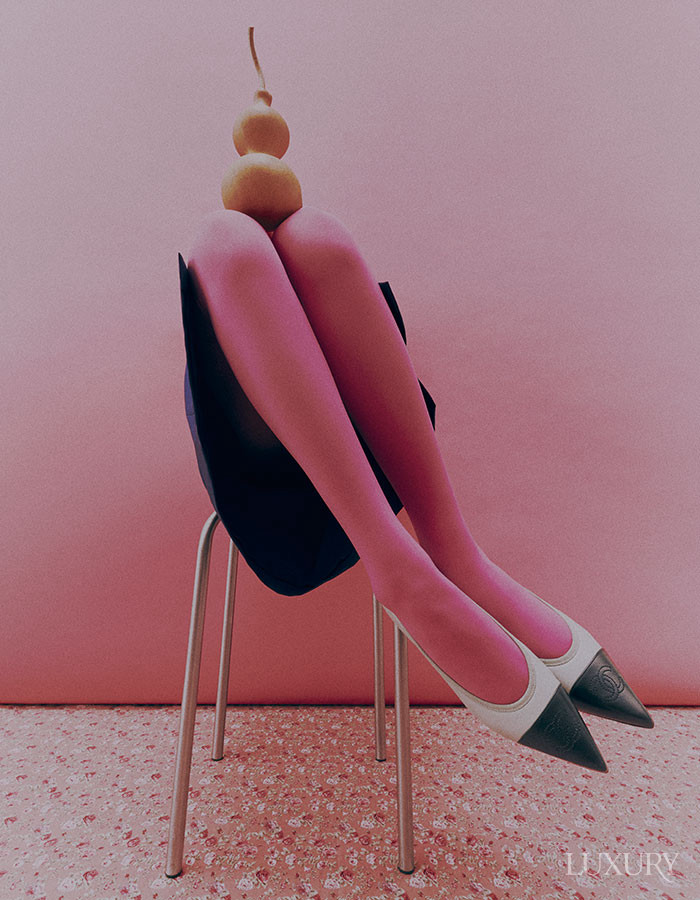 네이비 컬러 슬릿 스커트는 펜디. 이리데슨트 램스킨 ‘발레리나 플랫’ 슈즈는 샤넬.