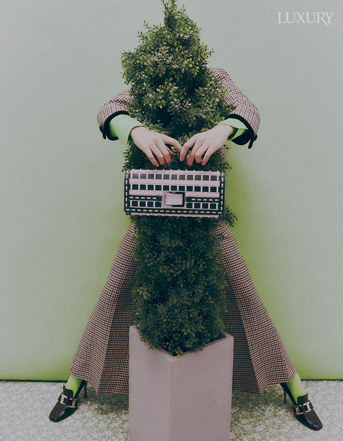 시어 칼라 블루종 재킷과 사이드 슬릿 스커트 모두 펜디.