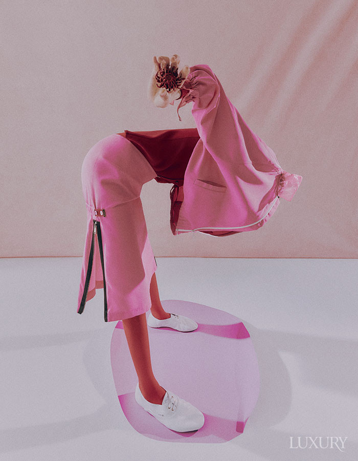리나일론 블루종 재킷과 레드 피케 셔츠, 포플린 쇼츠 모두 프라다. 샤이니 그레인드 카프스킨 스트랩 클러치 백은 샤넬. 램스킨 ‘앤톤 워크’ 로퍼는 로로피아나.