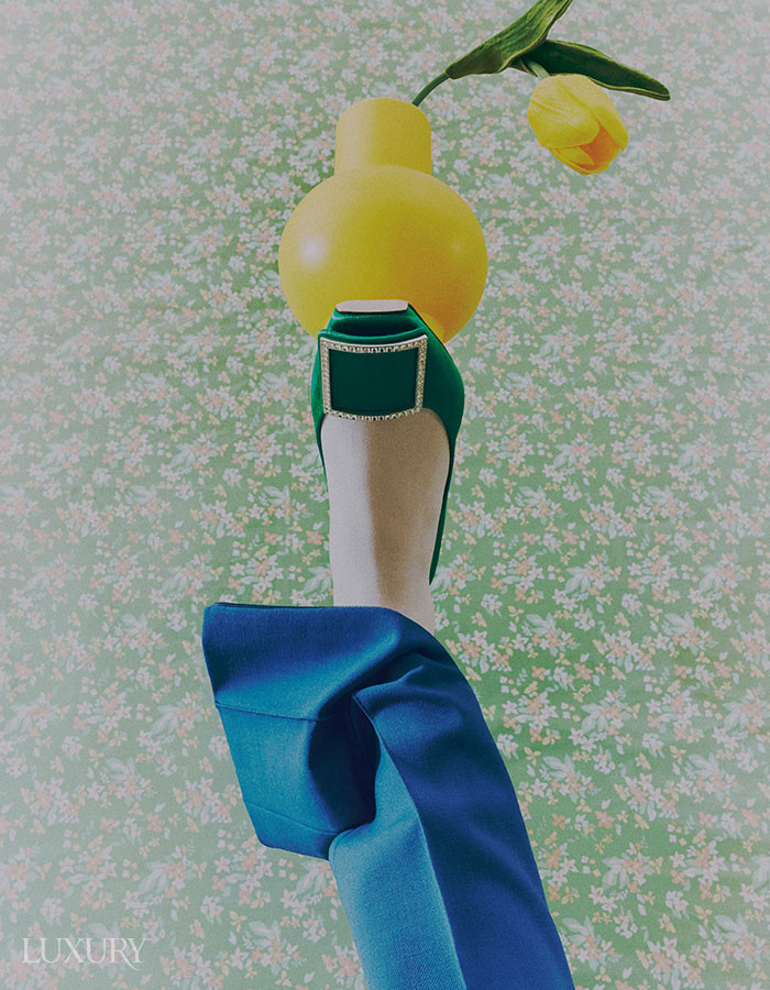 플라워를 장식한 ‘로즈 비비에’ 새틴 슈즈는 로저 비비에.