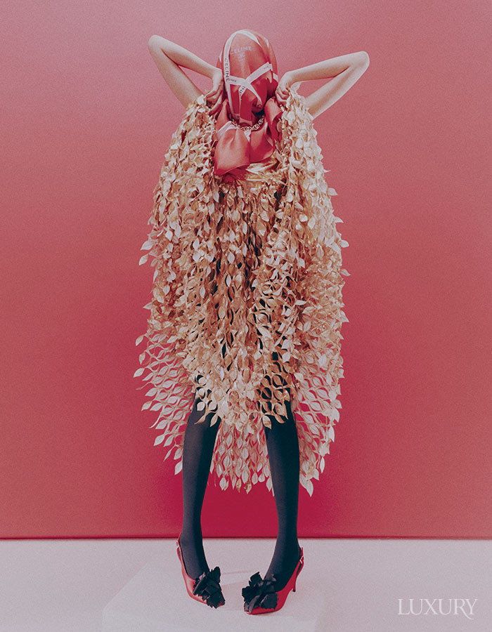 이파리 모티프의 골드 드레스는 가브리엘라 허스트. 실크 트윌 스카프는 셀린느. 네크리스로 연출한 체인 벨트는 샤넬. 플라워 장식의 새틴 슬링백 슈즈는 페라가모.