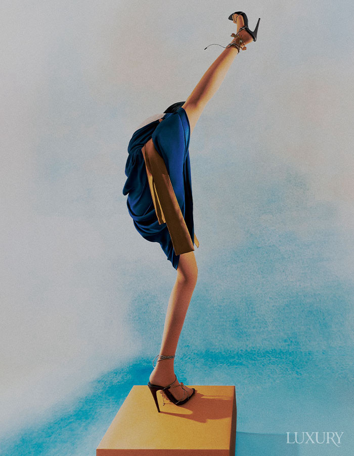 실크 새틴 드레이프 랩 드레스, 레이스업 앵클 스트랩과 참 장식이 돋보이는 샌들 모두 생 로랑 by 안토니 바카렐로.