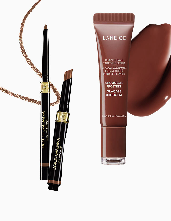 브라운 컬러 립 라이너와 글로스 스틱 듀오로 구성된 ‘키스 마이 글로스 #03 챗’. 핑크 글리터가 섞인 글로 포뮬러가 한층 입체적인 립 메이크업을 완성한다. 6905-3470