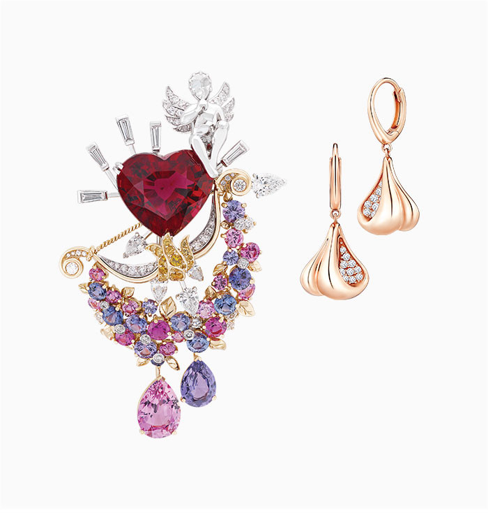 사랑의 전령 큐피드를 재현한 ‘시크릿 데 자모르’ 클립. 루벨라이트 하트 아래로 사파이어 화관과 다이아몬드 화살이 어우러져 연인 간의 사랑을 일깨울 준비를 하고 있다. 1877-4128