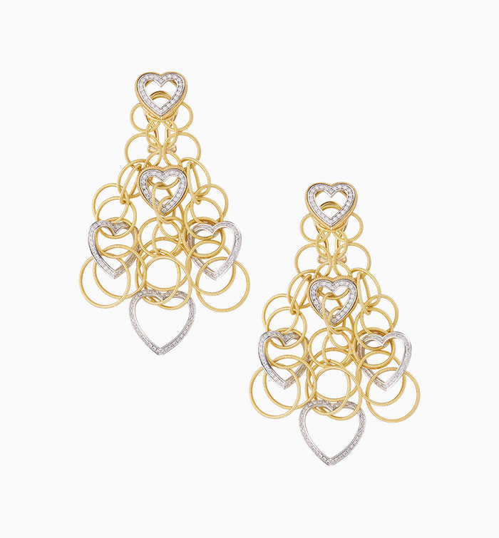하와이의 꽃목걸이를 오마주한 ‘하와이 다이아몬드’ 이어링. 장인이 꼰 금실 사이로 하트를 장식해 자연스럽게 얽힌 듯한 패턴을 이어나갔다. 6905-3490