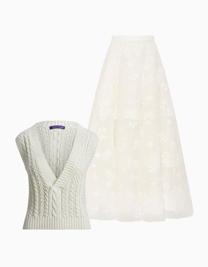 포인텔레 스티칭과 케이블 디테일을 다양한 레이아웃으로 구성한 니트 베스트. 3467-6560