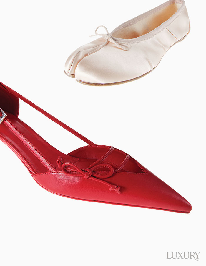 (위에서부터) 발등을 가로지르는 가는 스트랩과 작은 리본 디테일의 레드 펌프스는 프라다. 새틴 소재 타비 토에 가는 스트링 리본 매듭으로 포인트를 준 플랫 슈즈는 메종 마르지엘라.