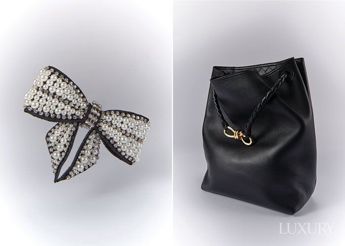 (왼쪽부터) 블랙 새틴에 크리스털과 인조 진주를 촘촘히 세팅한 리본 헤어 클립은 셀프포트 레이트. 놋 디테일로 입체감을 준 ‘안디아모’ 버킷백은 보테가 베네타.