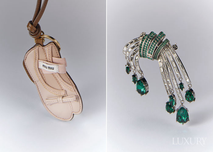 를 본뜬 참 장식은 미우미우. 여러 가닥으로 뻗은 브라스 소재의 끝부분마다 라인스톤을 장식한 브로치는 돌체앤가바나.