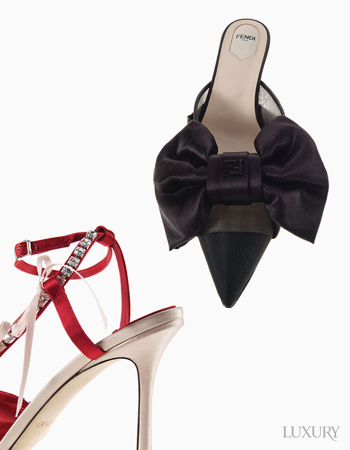 (왼쪽부터) 날렵한 실루엣에 큼직한 리본 장식으로 볼륨감을 표현한 슬링백 슈즈는 펜디. 크리스털 장식을 더한 레드 스트랩과 새틴 리본 디테일이 로맨틱한 분위기를 자아내는 스틸레토 힐은 지미추.