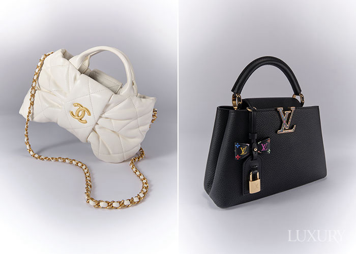 (왼쪽부터) 보 셰이프의 램스킨 미니백은 샤넬. 컬러 모노그램 패턴 블랙 리본 참으로 디테일을 가미한 ‘카퓌신’ 백은 루이 비통.