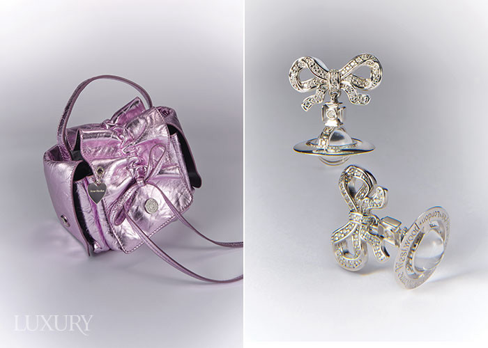 (왼쪽부터) 주름을 잡아 묶은 듯한 큼직한 보 디테일로 전면을 가득 채운 멀티 포켓 백은 아크네 스튜디오. 리사이클 스털링 실버로 리본 모티프를 입체감 있게 표현한 이어링은 비비안 웨스트우드.