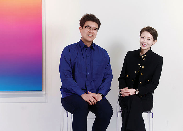의료 공간에서 협업 전시를 기획한 창원 모두치과의원 이장원 원장과 샤아트컴퍼니 박진희 대표.