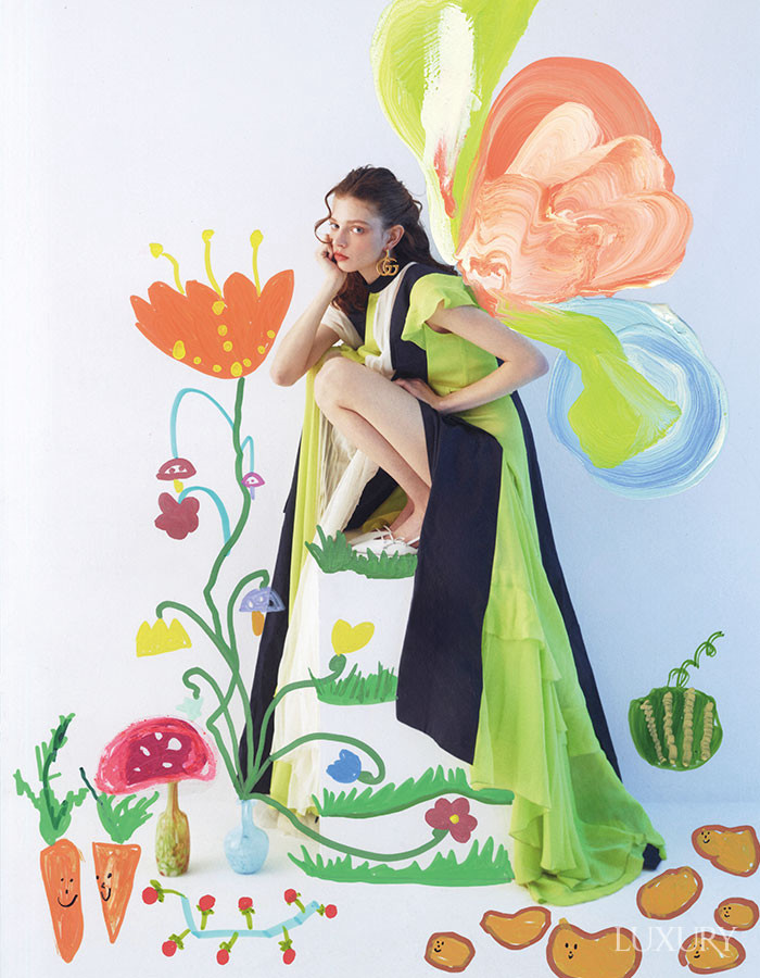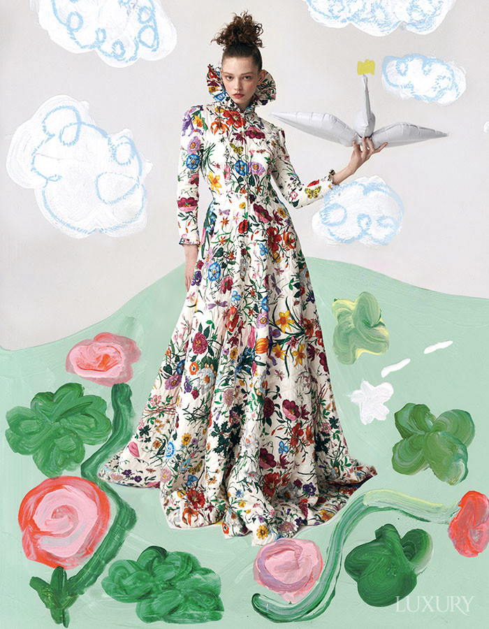 드라마틱한 실루엣의 GG 프린트 실크 시폰의 롱 드레스 GUCCI. 다채로운 컬러의 크리스털로 하트 셰이프를 완성한 이어링 SELF-PORTRAIT.