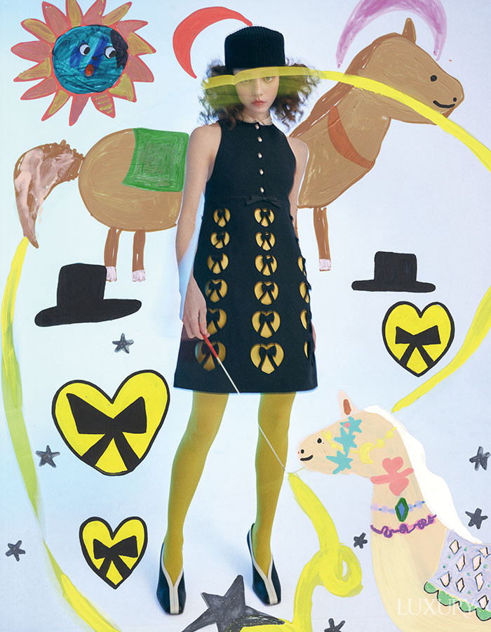 보 장식 미니드레스 VALENTINO. 니티드 스퀘어 캡 LOUIS VUITTON. 세련된 배색 포인트가 특징인 램스킨 펌프스 CHANEL.