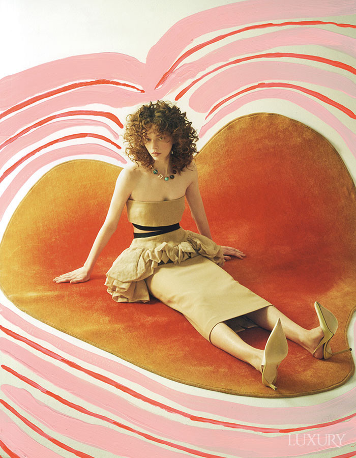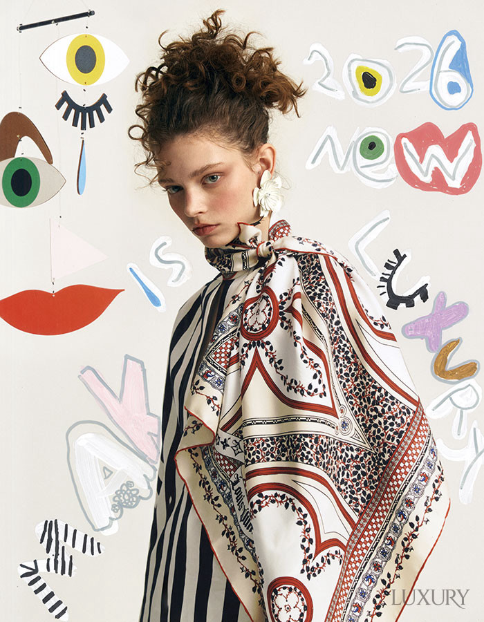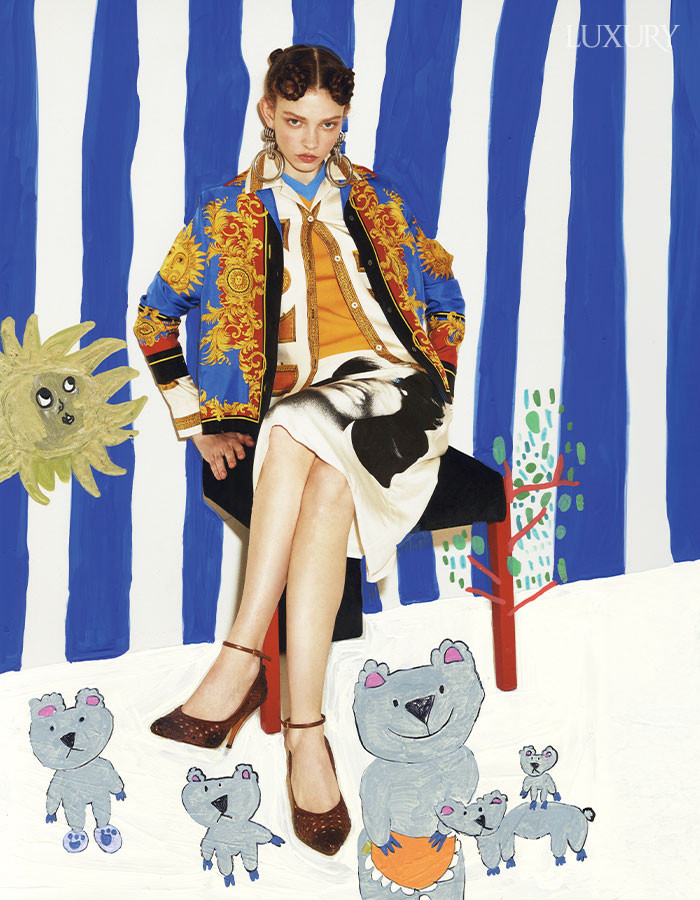 울 실크 풀오버와 실크 스커트 모두 CHANEL.