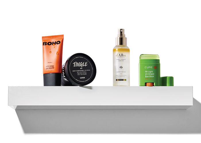 왼쪽부터) 하이퍼 디펜스 선스크림 백탁 없이 가볍게 발려 사계절 내내 사용하기 좋다. 덧발라도 답답하지 않다는 점이 가장 큰 장점. 보호. 팅글 보디 컨디셔너 멘톨과 페퍼민트가 주는 즉각적인 쿨링감이 짜릿할 정도로 개운하다. 아침 러닝 후 사용하면 하루의 컨디션이 확실히 달라진다. 러쉬. 화이트 트러플 퍼스트 스프레이 세럼 러닝 후 달아오른 피부를 빠르게 진정시킨다. 수분 미스트보다 보습감이 좋아 꾸준히 쓰고 있는 제품. 달바. 큐어 에어라이트 UV 쉴드 선스틱 SPF 50+ / PA++++ 이마, 콧등, 광대처럼 햇빛에 노출이 많이 되는 부위는 선스틱으로 수시 보강한다. 김정문알로에.