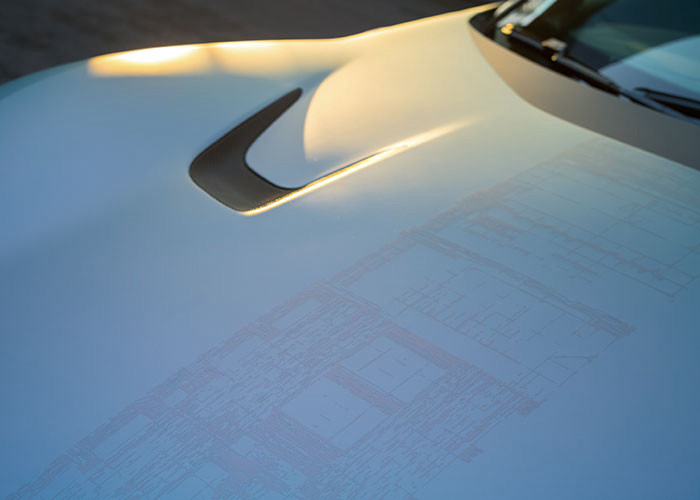 엔진에서 영감을 받은 작품 ‘Music for 12 Lines’(2026)가 리버리 디자인으로 구현된 점이 인상적이었어요. 이 작품은 어떻게 탄생했나요? 지인 작곡가가 곡을 만드는 행위는 마치 화가가 드로잉을 하듯이 오선지 위에 악보를 그리는 거예요. 그런데 저희가 작업을 하면서 ‘오선지에 음표를 그리는 것만으로 우리가 하고 싶은 이야기를 다 표현할 수 있을까?’라는 생각이 들었습니다. 오선보는 왼쪽부터 오른쪽까지 하나씩 음표를 읽는데, 저희가 하고자 하는 이야기는 선형적이지 않거든요. 페라리 V12 엔진의 소리를 음악적인 언어로 변환해서 분석을 하다 보니, 엔진 구조상 필연적으로 만들어낼 수 있는 배음 구조가 있었어요. 이 음악의 언어를 가져와서 배음 구조에 따른 화음을 갖춘 음악을 만들었고, 그것을 저희가 하던 방식대로 ‘악보’라는 언어로 기록했습니다. 그리고 그 악보를 엔진과 가장 가까운 보닛 위에 얹으니 디자인 언어로 바뀌게 된 거예요.