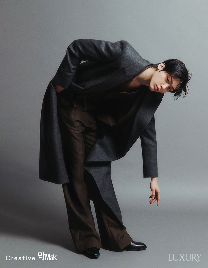 그레이 코트, 브라운 재킷, 베스트, 팬츠 모두 KIMSEORYONG. 블랙 로퍼 SAINT LAURENT BY ANTHONY VACCARELLO.