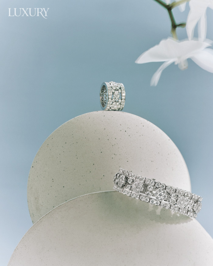 플래티넘 소재에 다이아몬드를 세팅한 ‘스노우플레이크’ 링, 화이트 골드에 다이아몬드를 세팅한 ‘스노우플레이크’ 브레이슬릿 모두 반클리프 아펠.