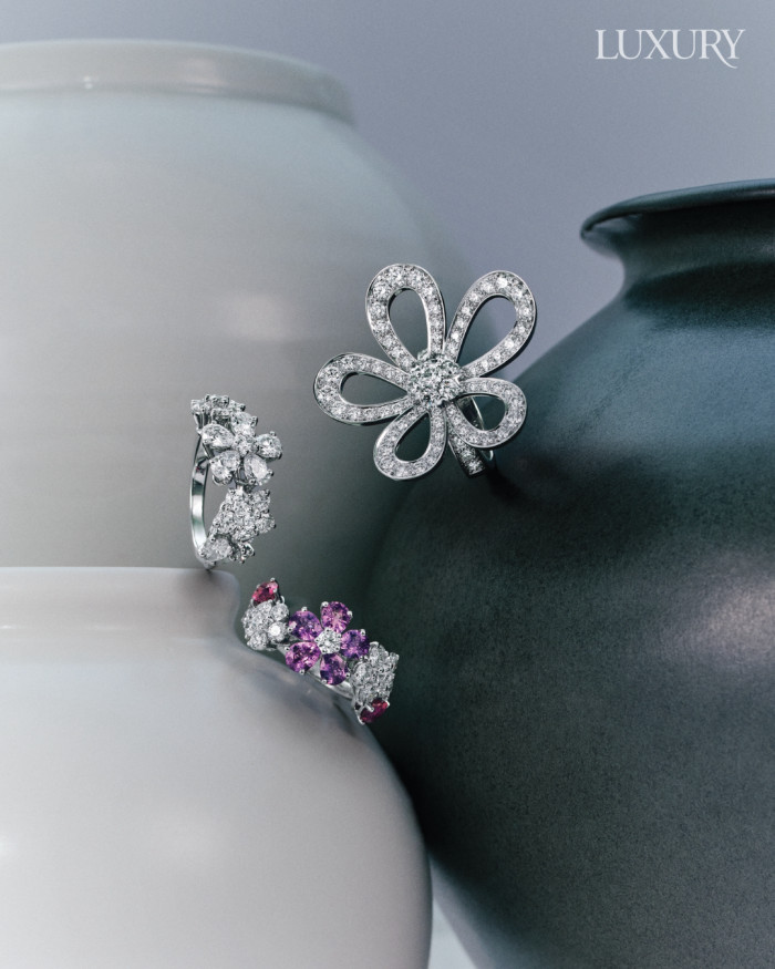 오픈워크 기법으로 다이아몬드의 광채를 강렬하게 전하는 ‘플라워레이스’ 링, 화이트 골드에 라운드와 페어 컷 다이아몬드를 세팅한 ‘폴리 데 프레’ 링, 화이트 골드에 페어 컷 핑크 사파이어와 퍼플 사파이어, 다이아몬드를 세팅한 ‘폴리 데 프레’ 링 모두 반클리프 아펠.