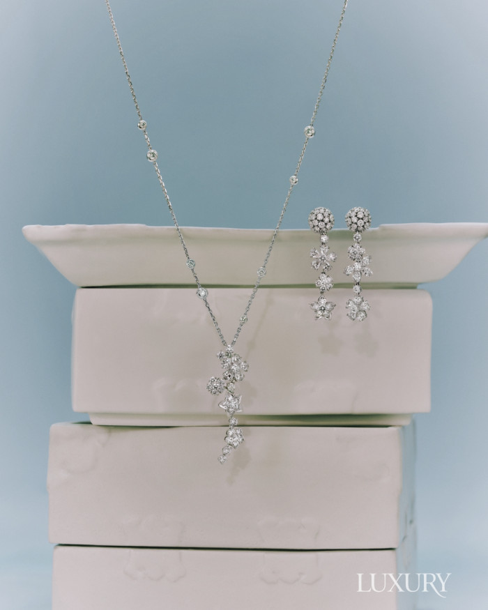야생화의 우아함을 다이아몬드로 표현한 ‘폴리 데 프레’ 컬렉션은 완벽한 비율과 조화가 드러나도록 생동감 있게 다이아몬드를 배치한다. 화이트 골드에 라운드 및 페어 컷 다이아몬드를 세팅한 ‘폴리 데 프레’ 펜던트, 화이트 골드에 라운드·마르키즈·페어 컷 다이아몬드를 세팅한 ‘폴리 데 프레’ 이어링 모두 반클리프 아펠.