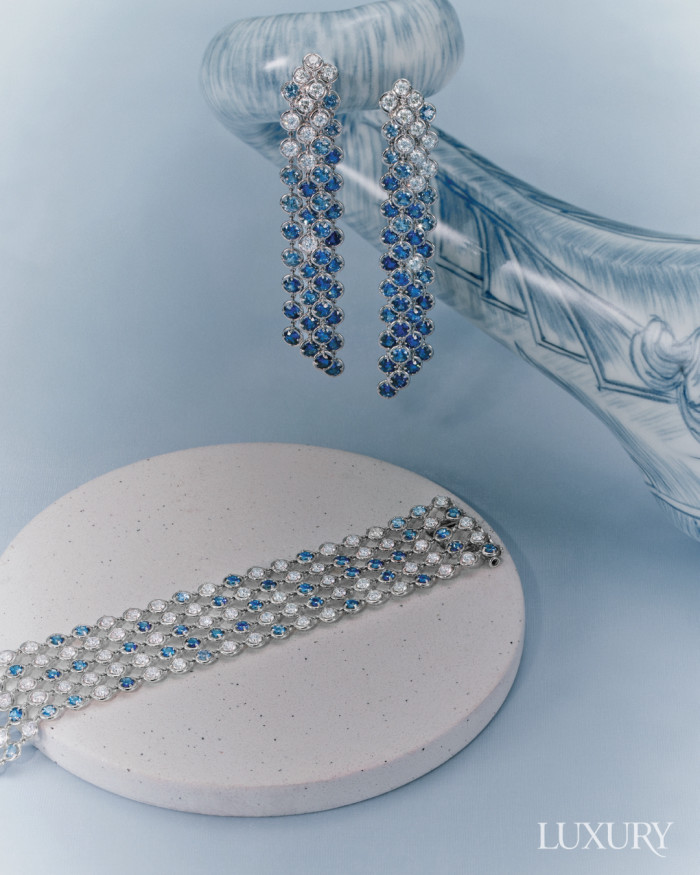 사막의 팔미르 오아시스에서 떨어지는 물방울을 연상시키는 ‘팔미르’ 컬렉션은 유연함과 아름다운 컬러 조합이 돋보이는 컬렉션이다. 화이트 골드에 사파이어와 다아아몬드를 세팅한 ‘팔미르’ 이어링, 브레이슬릿 모두 반클리프 아펠.