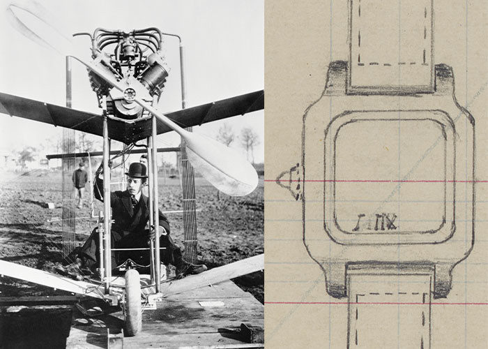 (왼쪽부터) 1907년 No.15 비행기와 함께한 산토스-뒤몽의 모습. 1911년의 산토스 뒤몽 워치 스케치.