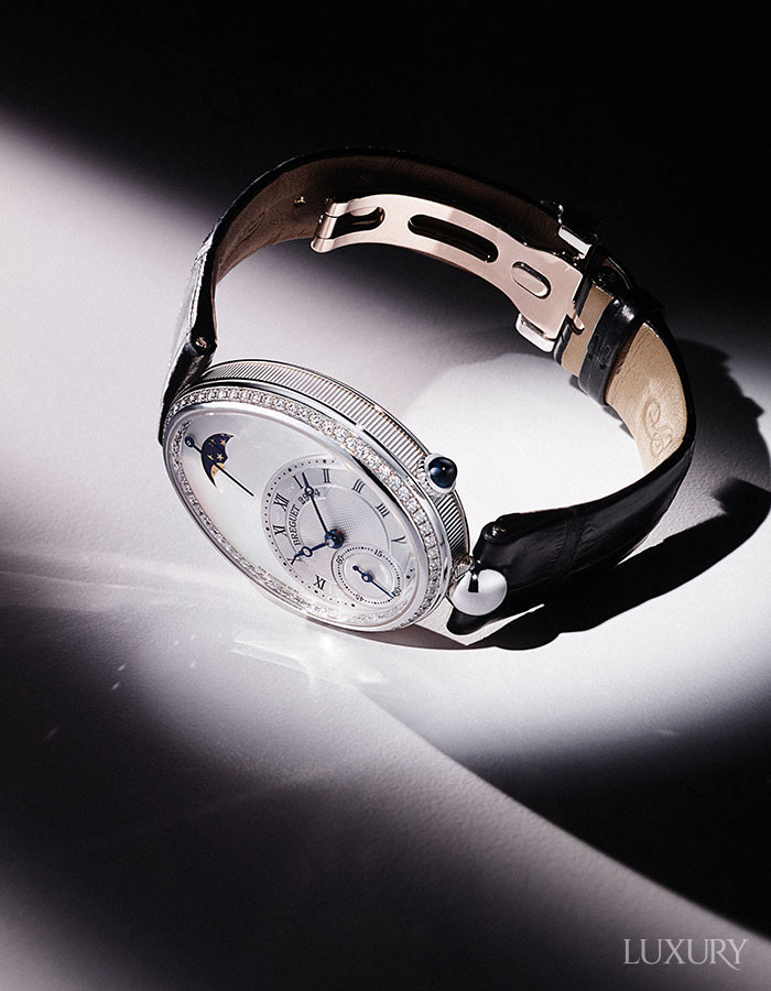 화이트 머더오브펄 다이얼을 매치하고 안쪽 테두리와 베젤에 128개의 다이아몬드를 세팅했다. BREGUET.
