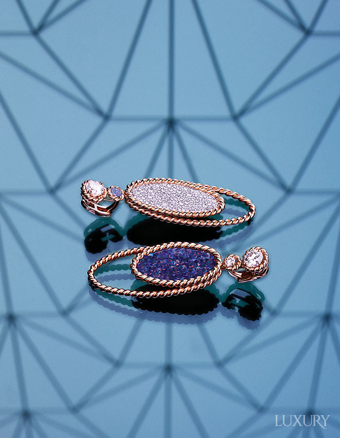 로즈 골드 비즈로 정교하게 직조한 루프와 오팔을 세팅한 내부 루프의 중첩이 완벽한 균형을 이루는 ‘골드 루프’ 하이 주얼리 이어링. 메종 설립 150주년을 기념해 탄생했다. PIAGET.
