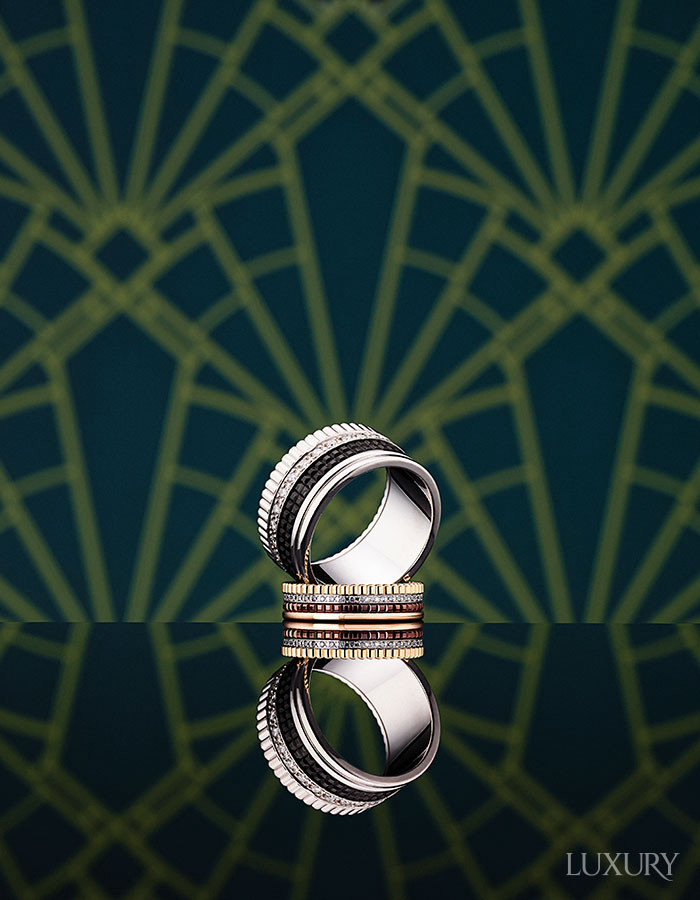 클루 드 파리부터 고드롱의 유연한 직선까지 메종의 코드를 굴뚝 조립 방식으로 결합한 ‘콰트로 블랙 다이아몬드’ 라지 링, 세 가지 골드 소재로 네 가지 코드를 압축한 ‘콰트로 클래식 다이아몬드’ 엑스스몰 링. 수학적 계산을 바탕으로 정교하게 쌓아 올린 4개의 밴드는 파리의 건축적 정신을 고스란히 투영한다. 모두 BOUCHERON.