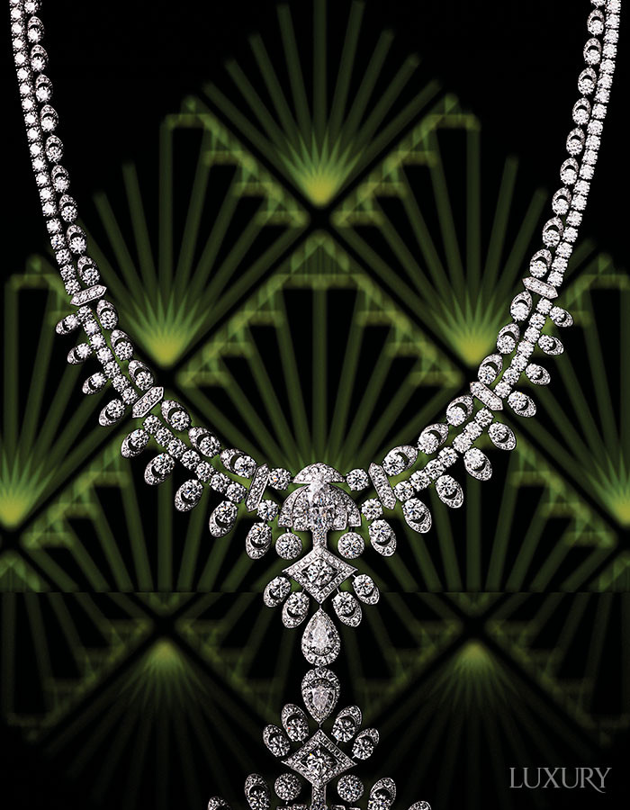 완벽한 대칭을 이루는 ‘그라프 라운드와 페어 셰이프 그리고 오벌 다이아몬드’ 네크리스. 총 40.12캐럿의 다이아몬드가 내뿜는 빛의 파편들이 질서 정연한 패턴 속에서 대담한 광채를 발산한다. GRAFF.