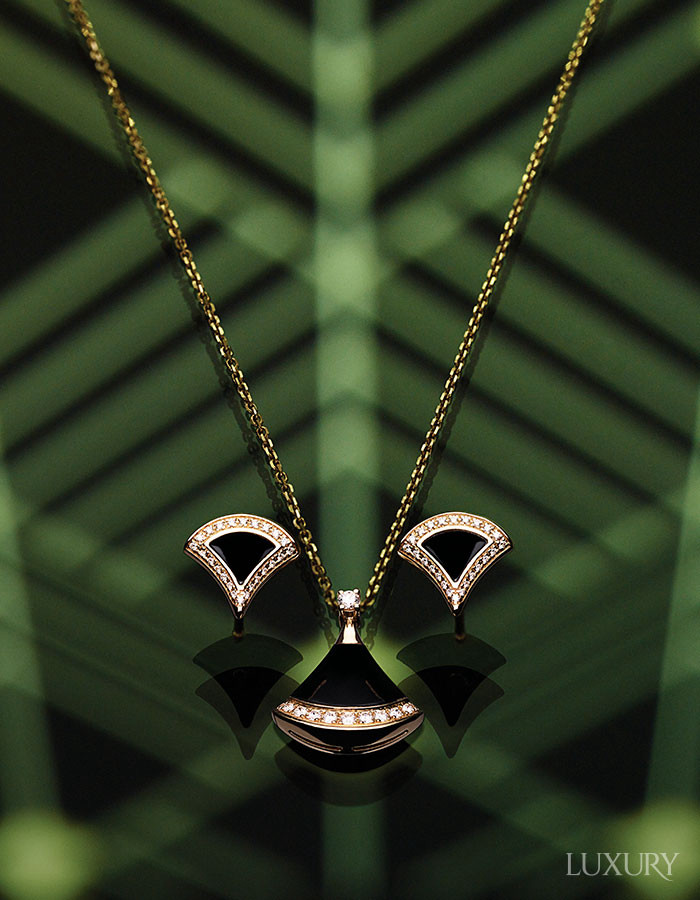 로마 카라칼라 욕장의 부채꼴 모자이크 패턴을 모던하게 재해석한 ‘디바스 드림’ 네크리스와 이어링. 블랙 오닉스와 다이아몬드 파베 세팅의 선명한 대비가 부채꼴 실루엣의 입체감을 한층 부각한다. 모두 BVLGARI.