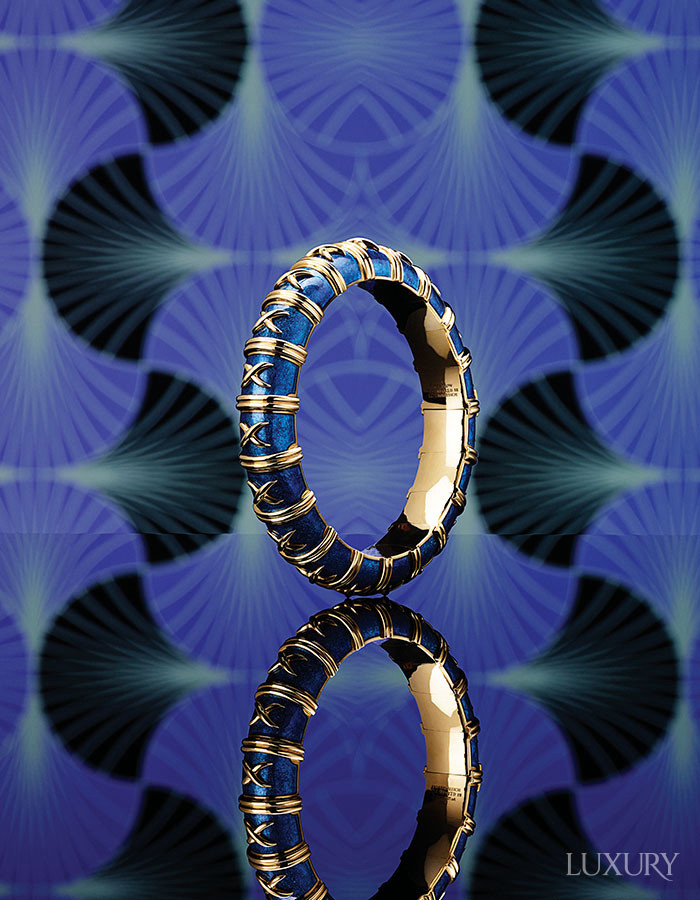 18K 옐로 골드의 X 모티프가 반복되며 기하학적인 율동감을 선사하는 ‘티파니 에나멜’ 컬렉션 브레이슬릿. 파요네 에나멜링으로 깊고 선명한 블루 컬러를 구현하고, 고급 골드 포일을 여러 차례 레이어링해 완성했다. TIFFANY & CO.