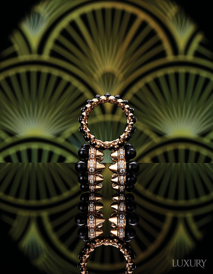 뾰족한 스터드와 둥근 비즈라는 상반된 도형을 반복적으로 배치한 ‘클래쉬 드 까르띠에’ 링과 이어링. 핑크 골드와 블랙 오닉스의 강렬한 조우가 조형적인 입체감을 극대화한다. 모두 CARTIER.