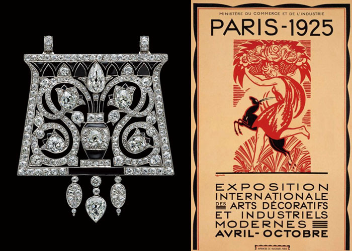 (왼쪽부터) 플래티넘 위에 다이아몬드와 오닉스가 완벽한 대칭 구조를 이루는 1920년의 ‘이집트’ 펜던트. ALBION ART JEWELLRY INSTITUTE. 아르데코 양식의 시초가 된 1925년 파리 현대 장식·산업 예술 국제 전시회 포스터.