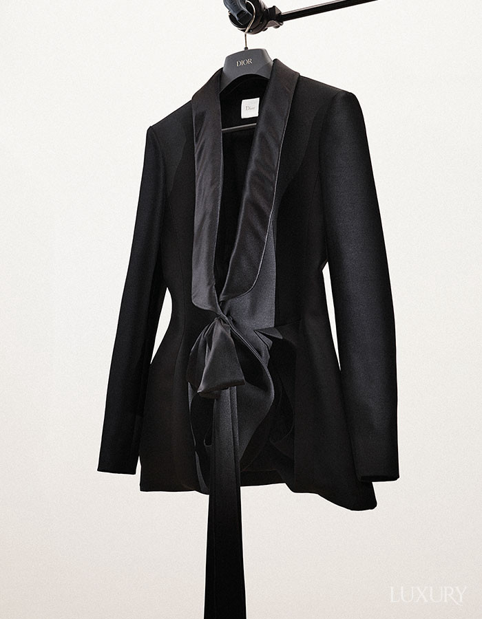 새틴 칼라 디테일과 허리 부분의 리본 장식이 우아함을 드리우는 테일러드 턱시도 재킷 DIOR.
