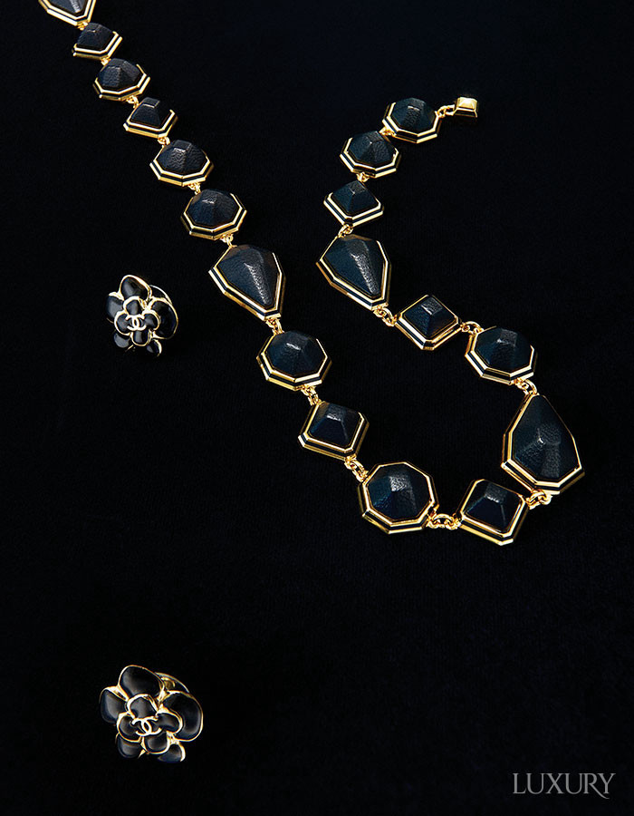 메탈 플라워 이어링 CHANEL. 서로 다른 셰이프가 어우러져 볼드한 존재감을 발하는 브라스 소재의 ‘주아유 드 퀴르’ 네크리스 HERMÈS.