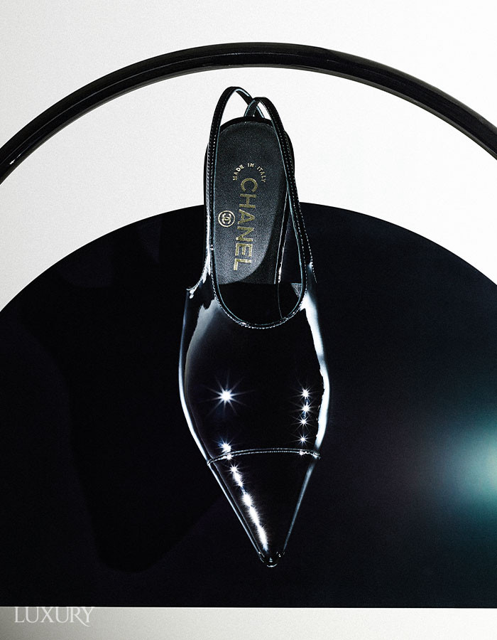 발등을 자연스럽게 덮는 디자인과 차분하고 우아한 실루엣이 시선을 사로잡는 페이턴트 카프스킨 뱀프힐 슈즈 CHANEL.