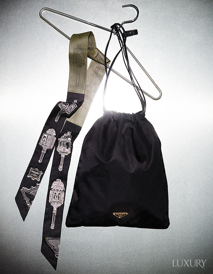 실크와 카프스킨 서로 다른 두 가지 소재를 매치한 ‘콜리에 프레시유 메르베유즈 렁테르느’ 트윌리 스카프 HERMÈS. 경량감이 탁월한 ‘위시’ 리나일론 파우치 PRADA.