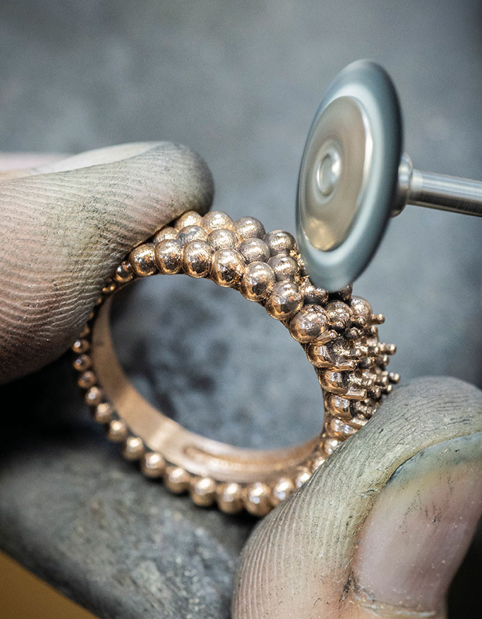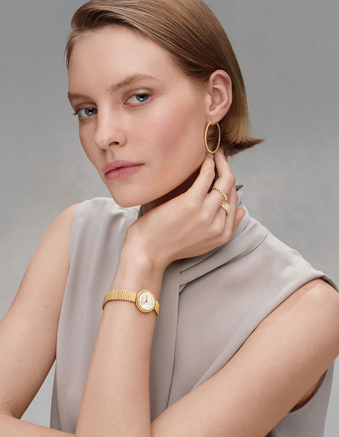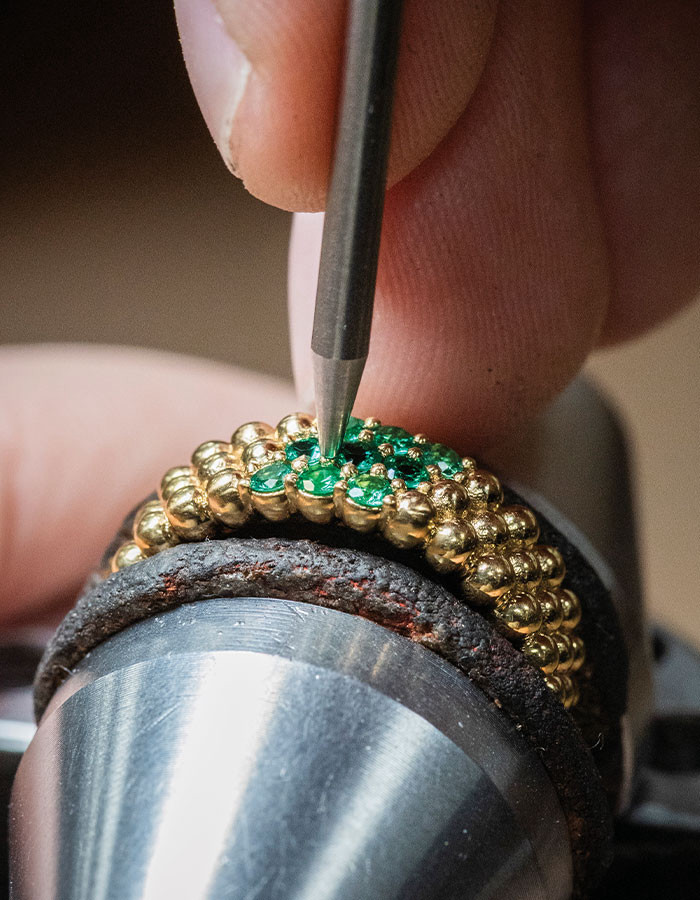 새롭게 선보이는 ‘뻬를리 3-로우 링Perlée Three-Row Rings’은 골드 비즈 특유의 조형미를 집약적으로 담아낸 작품이다. 로스트 왁스 주조 기법을 통해 옐로·로즈 골드·화이트 골드로 정교하게 구현되며, 숙련된 장인의 손길로 완벽한 구형을 이루기까지 모든 공정이 세심하게 조율된다. 여러 단계의 폴리싱을 거친 비즈 표면에서는 고유의 깊은 광택이 살아나고, 정교한 마감은 각 비즈의 상단에 한층 선명한 반짝임을 더한다. 디테일을 향한 메종의 집념은 링의 뒷면에서도 드러난다. 벌집 모양의 오픈워크 구조를 적용해 스톤 사이로 빛이 자유롭게 투과되도록 설계함으로써 보석 본연의 광채를 극대화한 것. 여기에 뻬를리의 미학을 반영한 라운드 팁 네일 세팅을 더해 스톤을 견고하게 고정하고, 각 네일이 최대 3개의 스톤을 밀접하게 지탱하도록 정교하게 구성했다. 서로 맞닿은 젬스톤들은 색과 빛을 교차시키며, 손끝 위에 다채롭고 생동감 넘치는 광채의 표면을 완성한다.