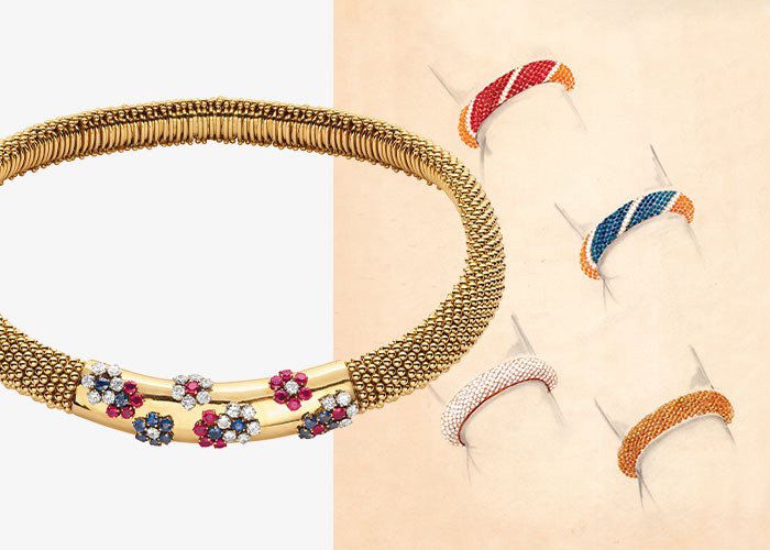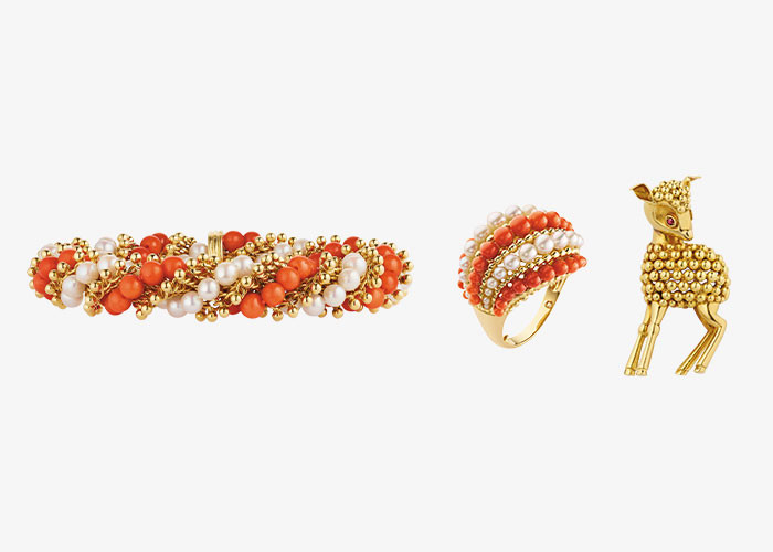 (왼쪽부터) 1963년경, 옐로 골드에 코럴, 컬처드 펄과 골드 비즈를 섬세하게 꼰 트위스트 형태의 ‘트위스트’ 링과 브레이슬릿. 1956년, 옐로 골드에 루비를 세팅해 메종의 독자적인 미학을 보여준 ‘리틀 도Little Doe’ 클립.