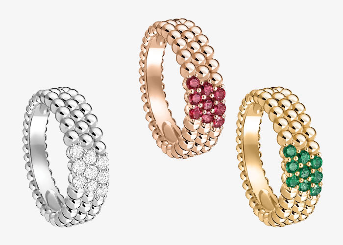 (왼쪽부터) 화이트 골드에 다이아몬드를 세팅한 ‘뻬를리 다이아몬드 3-로우 링’. 로즈 골드에 루비를 세팅한 ‘뻬를리 컬러 3-로우 링’. 옐로 골드에 에메랄드를 세팅한 ‘뻬를리 컬러 3-로우 링’.